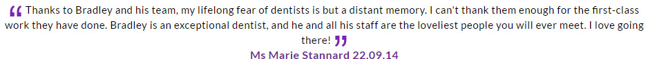 I was not disappointed in my result, after a long 12 months, and I can't say it was an easy one for me, I have nothing but praise for Bradley and his team for their patience, dedication, professionalism, kindness, skill and above all his passion in his work, giving me my confidence to smile again freely. After seeing my results my partner is now attending the practice after probably not attending a dentist in 20 years!! So once again many thanks.