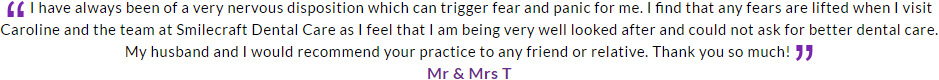 If there is anyone out there as scared as I was of the Dentist please visit Caroline and her team at Smilecraft, now I have been and had all my treatment and had my teeth cleaned by Janet the hygienist. I cannot believe how good I feel after all the years of being too frightened to go.
