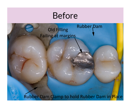 - Isolation – We use a rubber dam to properly isolate the tooth being filled, keeping the tongue, cheek and saliva away from the area being worked on to avoid contamination.